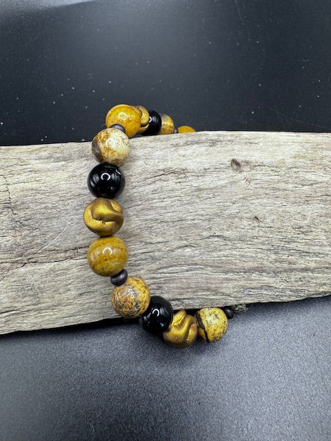 Midnight Brew is a 7-inch stretch bracelet that blends the richness of roasted hues with the sleek allure of polished black. Coffee stripe agate beads swirl with caramel and espresso tones, each one unique like a handcrafted latte. Anchored by glossy black onyx and golden accents, this piece channels warmth, resilience, and quiet luxury. Whether worn solo or stacked, it’s a grounding companion for those who savor style with depth.