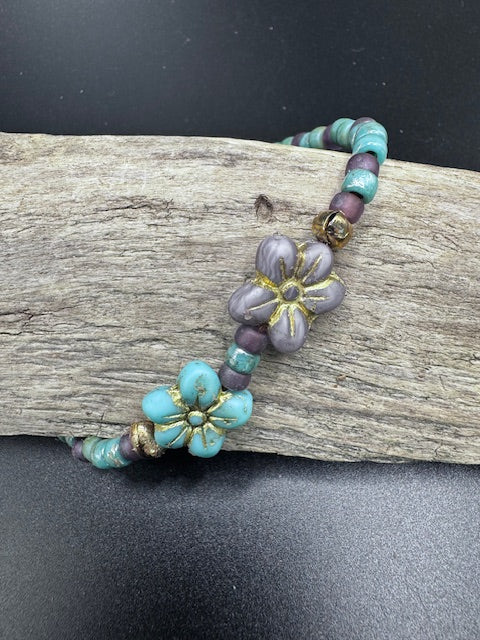 Let your spirit bloom with Whispers of Wildflower, a handcrafted bracelet that captures nature’s quiet elegance. Centered around two radiant flower beads—one in twilight purple, the other in tranquil turquoise—each petal is kissed with golden accents that shimmer like morning dew. A harmonious dance of turquoise, plum, and warm brown beads encircles the wrist, evoking forest trails and sunlit meadows. This piece is a celebration of untamed beauty and gentle strength, perfect for those who carry the wild in their heart and grace in their stride.